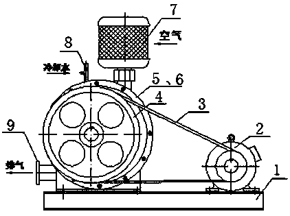 2)降低制造成本,本實用新型可節(jié)省零部件:1個油水分離罐;1個通常嵌焊于底座內(nèi)的貯油箱;1 套回油管路;同時,風鼓內(nèi)部不需加工進風槽,可用無縫鋼管焊制風鼓,風鼓的制造材料節(jié)省40%,加工過程更簡單,因此,本實用新型的總制造費用比同型號傳統(tǒng)回轉(zhuǎn)鼓風機節(jié)約8~10%;