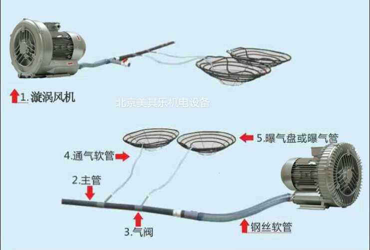 采用高壓鼓風(fēng)機或漩渦氣泵將空氣送入輸氣管道,輸氣管道將空氣代送入微孔管,微孔管將空氣以微氣泡形式分散到水中,微氣泡由池底向上升浮,氣泡在氣體高氧分壓作用下,氧氣充分濟入水中,還可造成水流的旋轉(zhuǎn)和上下流動、水流的上下流動將上層富含氧氣的水帶入底層,網(wǎng)時水流的旋轉(zhuǎn)流動將微孔管周圍富含氧氣的水向外擴散,實現(xiàn)池水的均勻增氧。
